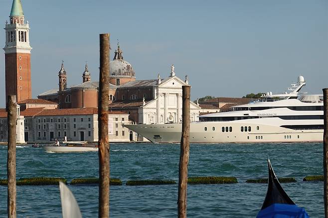 | ▲ 2025년 7월 3일(현지시간) 제프 베이조스의 결혼식 행사가 열렸던 이탈리아 베네치아 산 조르조 마조레 성당(Abbazia di San Giorgio Maggiore) 앞으로 슈퍼요트가 지나가고 있다. |