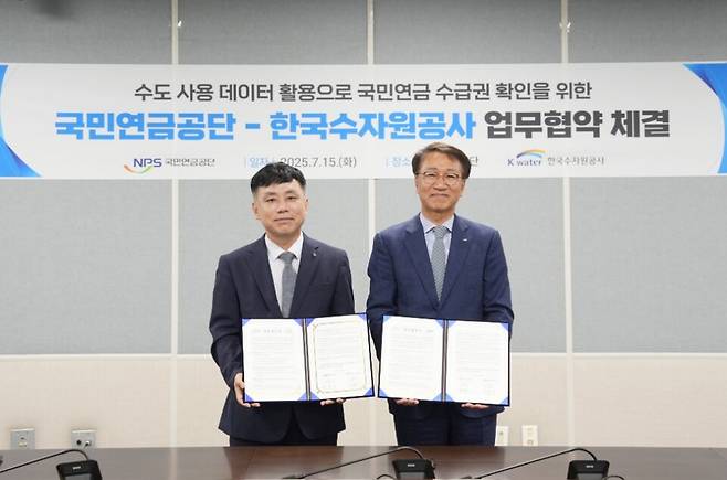 한국수자원공사와 국민연금공단은 15일 전북 전주시 국민연금공단 본부에서 양 기관이 보유한 데이터를 연계·활용해 행정의 효율성을 높이고 국민에게 더 나은 복지 서비스를 제공하기 위해 '데이터 기반 행정 협력을 위한 업무협약'을 체결했다고 밝혔다.