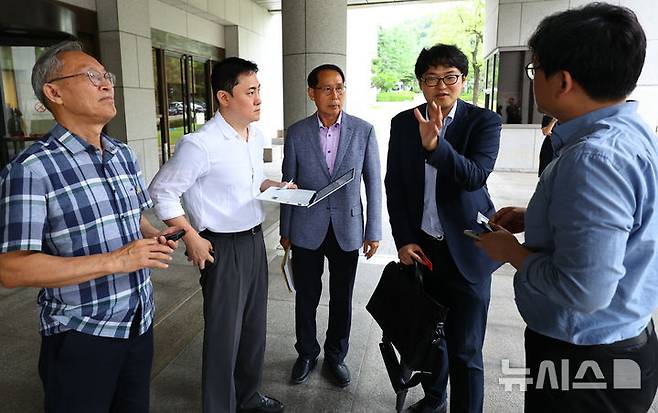 [서울=뉴시스] 최진석 기자 = 16일 서울 서초구 대법원에서 열린 용인경전철 주민소송 관련 재상고심을 마친 뒤 주민소송단과 김철 변호사가 발언을 하고 있다.