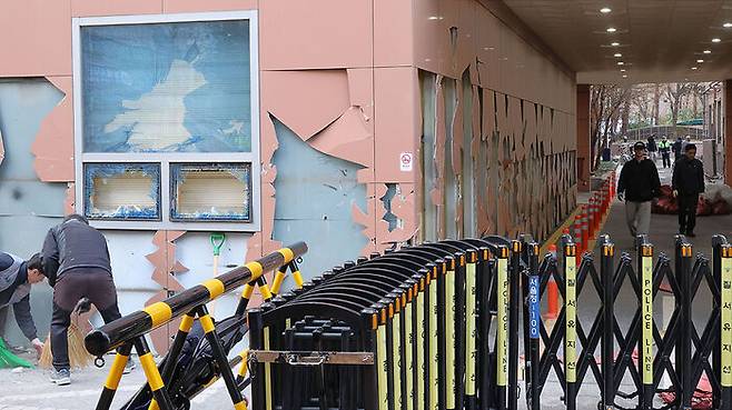 ▲ 폭력 난동 사태로 파손된 서부지법에서 지난 1월 19일 오후 청사 관계자들이 복구 작업을 하는 모습