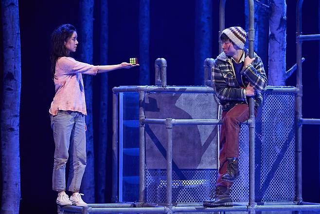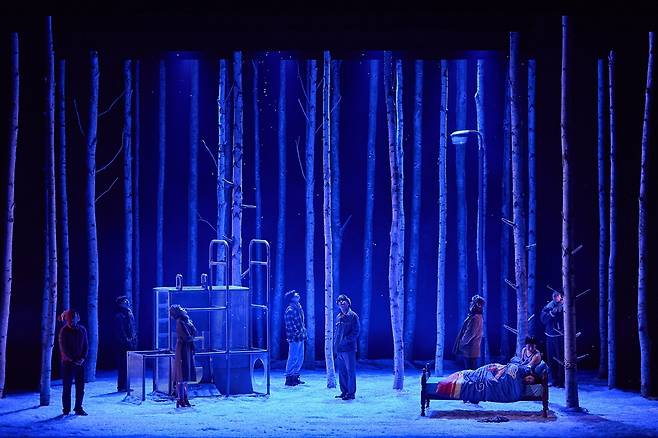 눈으로 뒤덮인 자작나무 숲. 학교폭력을 당하는 소년 '오스카'와 부자연스러운 몸짓과 말투를 가진 소녀 '일라이'가 만난다. 일라이는 오랜 시간을 살아왔지만 여전히 소녀의 모습을 하고 있는 뱀파이어다. 스웨덴의 작가 욘 아이비데 린드크비스트가 쓴 동명의 소설을 원작으로 한 연극 <렛미인>은 어딘가 스산한 분위기 속에서 시작한다.