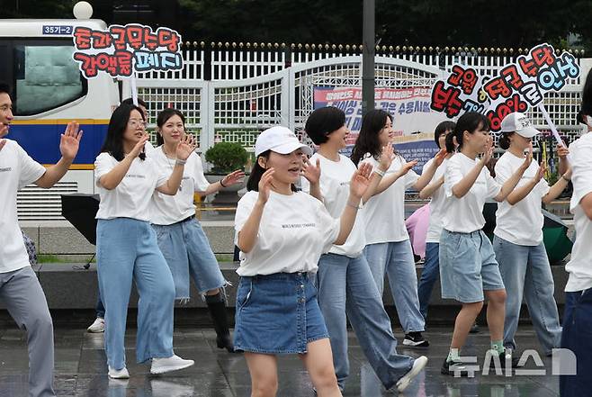 [서울=뉴시스] 김명원 기자 = 한국노총 소속 공무원 교사 60명이 16일 오전 서울 종로구 정부서울청사 앞에서 공무원 보수 현실화 촉구 플래시몹을 진행하고 있다. 2025.07.16. kmx1105@newsis.com