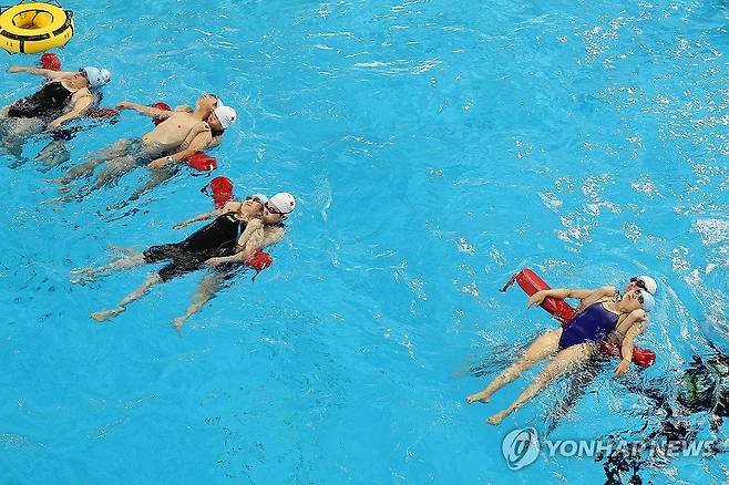 (대구=연합뉴스) 박세진 기자 = 16일 대구 두류다이빙풀장에서 열린 대한적십자사 대구지사의 인명구조요원 신규 과정 교육에서 강습생들이 장비구조 실습을 하고 있다. 강습생들은 장비구조, 수영구조 등 교육을 총 48시간 수강하며 최종 평가를 통해 인명구조요원 자격증을 취득한다. 자격증은 3년간 유효하다. 2025.7.16