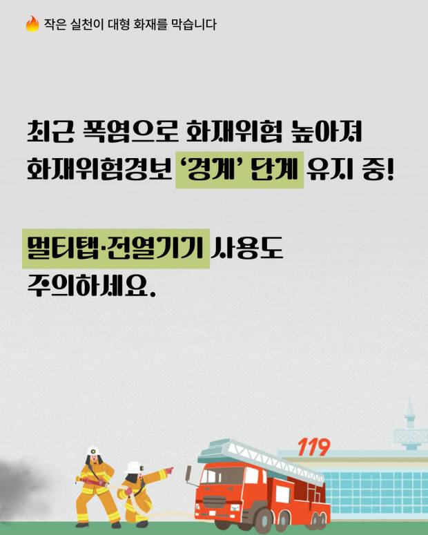 소방청은 현재 폭염에 따른 전기 과부하 위험이 커 화재위험경보를 ‘경계’ 단계로 유지 중이라고 밝혔습니다.