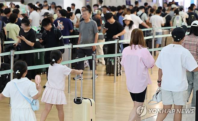 (영종도=연합뉴스) 이진욱 기자 = 여름 휴가철인 16일 인천 영종도 인천국제공항 1터미널이 탑승객들로 붐비고 있다. 2025.7.16