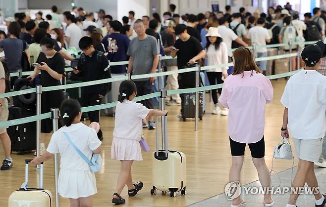 (영종도=연합뉴스) 이진욱 기자 = 여름 휴가철인 16일 인천 영종도 인천국제공항 1터미널이 탑승객들로 붐비고 있다. 2025.7.16