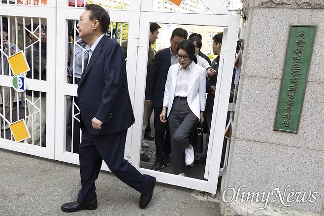 | ▲ 윤석열·김건희 부부가 제21대 대통령 선거일인 지난 6월 3일 오전 서울 서초구 원명초등학교에 마련된 서초4동 제3투표소에서 투표를 마치고 자리를 떠나고 있다. |