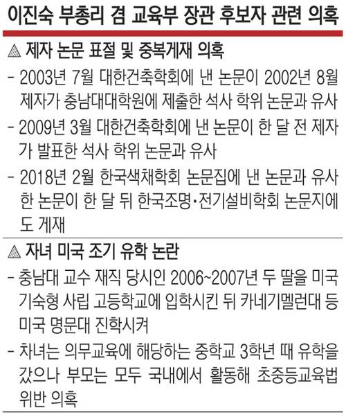 후보자의 이름을 ‘제1저자’로 올려, 제자의 학위 논문을 가로챘다는 의혹에 대해서도 이 후보자는 적극 방어했다. 이 후보자는 “학생이 학위논문을 쓰기 전 제가 국가 연구 프로젝트로 수주해 연구 책임자로 수행했던 연구들”이라며 “제가 제1저자가 되는 것은 너무나도 당연한 일”이라고 했다.
