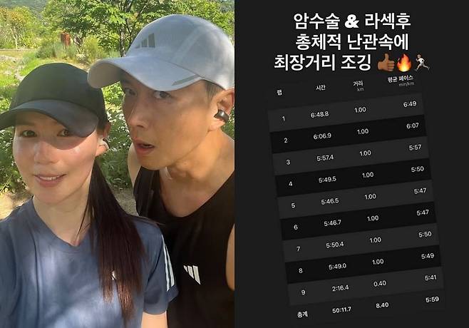 앞서 15일에도 진태현은 "암수술&라섹 후 총체적 난관 속에 최장거리 조깅"이라며 수술 이후에도 운동을 멈추지 않는 근황을 전한 바 있다.