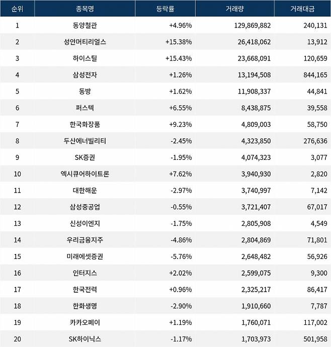 16일 한국거래소에 따르면, 동양철관(008970)이 1억2천9백만주 이상 거래되며 코스피 종목중 실시간 거래량 1위를 차지하고 있다.
