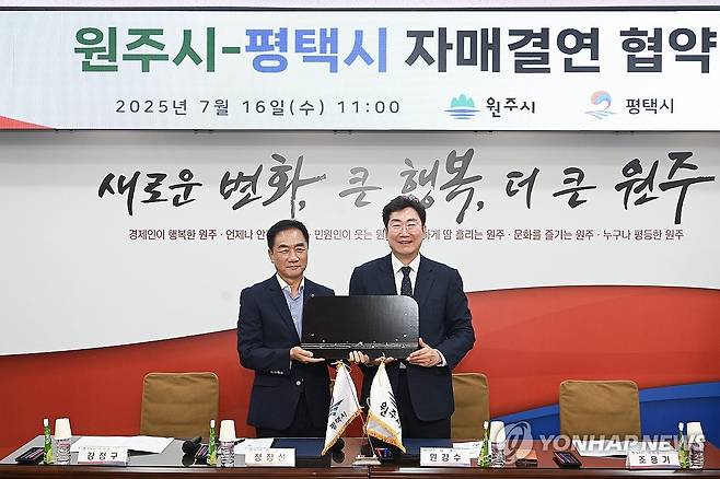 (원주=연합뉴스) 원주시와 평택시는 16일 원주시청에서 원강수 원주시장(오른쪽), 조용기 원주시의장, 정장선 평택시장(왼쪽), 강장구 평택시의장을 비롯한 관계자와 민간단체 대표 등 50여 명이 참석한 가운데 실질적인 교류를 본격화하기 위한 자매결연 업무협약을 체결했다. 2025.7.16 [원주시 제공.재판매 및 DB 금지]