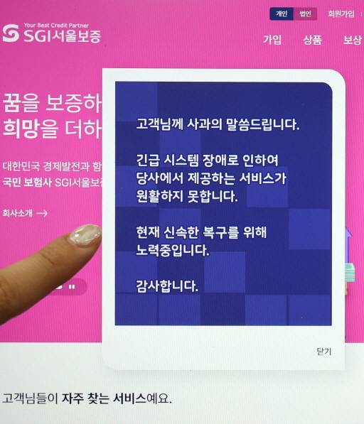 [SGI서울보증 시스템에 장애가 발생해 금융 소비자들이 불편을 겪고 있다. 14일 금융권에 따르면 이날 SGI서울보증 웹사이트에서 보증보험 관련 대부분 서비스를 이용할 수 없다. 사진은 SGI서울보증 웹사이트 팝업창. (사진=연합뉴스)]