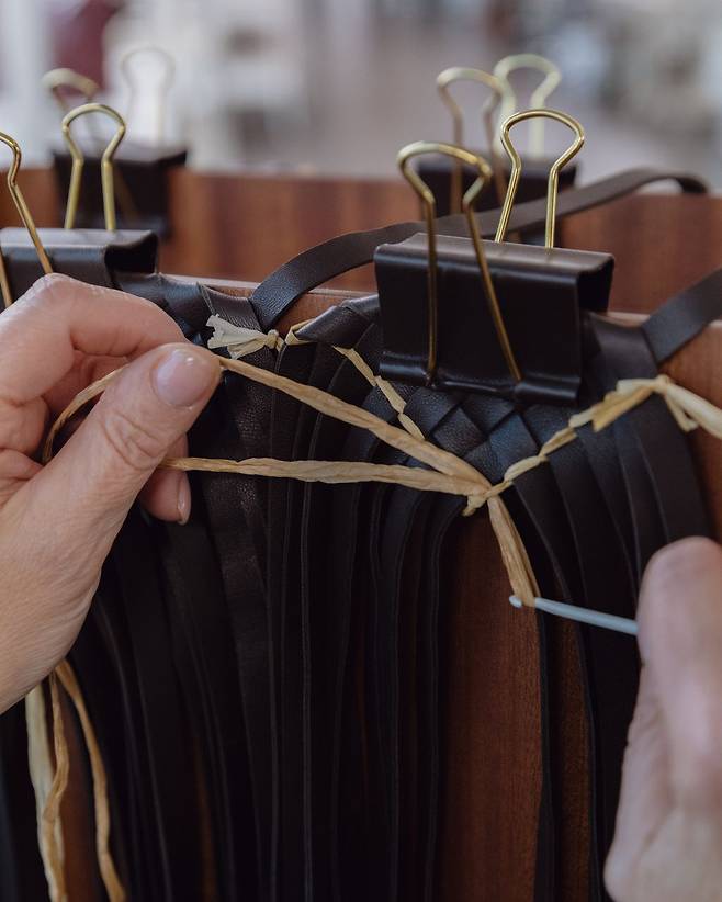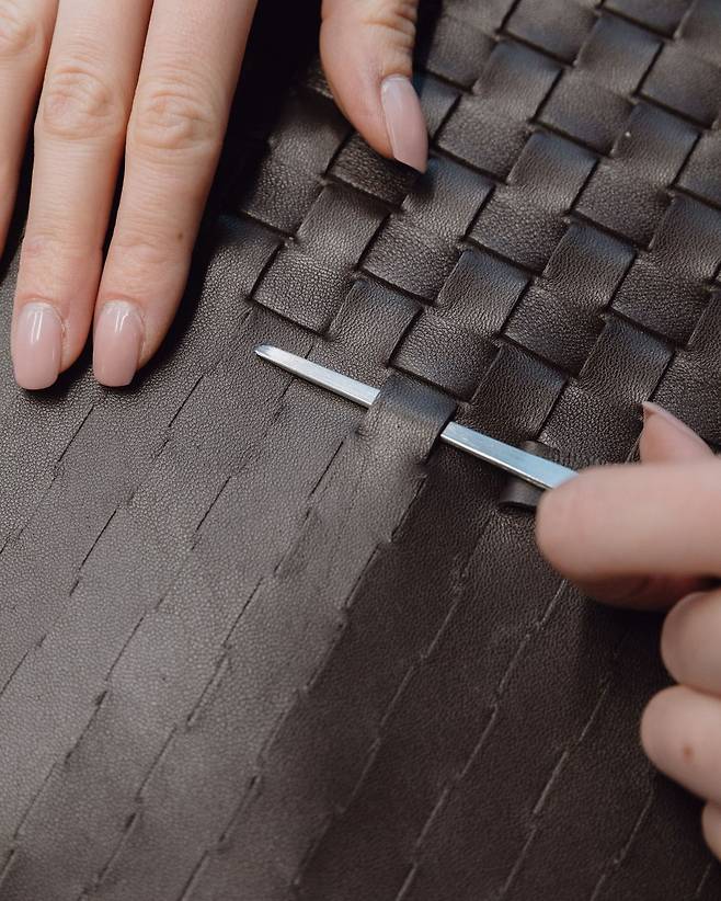 이탈리아어로 ‘직조, 엮음’이라는 뜻의 인트레치아토 는 얇고 가느다란 가죽 스트랩을 손으로 정교하게 엮는 수공예 기법을 일컫습니다. 그렇게 완성된 직조 패턴은 보테가 베네타를 식별하는 얼굴이자 브랜드 전체를 아우르는 징표로 널리 알려져 있죠. 그리고 이렇게 설명해도 무리가 없습니다. 보테가 베네타의 역사는 인트레치아토의 역사와 일맥상통합니다. 1970년대 중반 보테가 베네타의 장인들은 바느질이 어려운 두꺼운 가죽의 해법으로 끈처럼 얇게 절단한 가죽을 하나하나 엮었다고 합니다. 이 과정에서 내구성을 높이기 위해 기존의 수평 직조 대신 대각선으로 촘촘히 짜는 방법을 고안했는데, 결과물이 소스라치게 놀라웠습니다. 부드러운 실루엣과 역동적 미감을 갖춘 보테가 베네타의 독창적 디자인이 그렇게 탄생한 것이죠.
