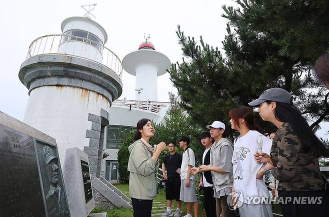 (인천=연합뉴스) 임순석 기자 = 제7회 세계등대의 날을 기념해 16일 인천 중구 팔미도등대에서 진행된 팔미도등대 청소년 체험교실에 참여한 학생들이 등대에 관한 설명을 듣고 있다.