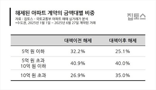 수도권 주택담보대출 한도를 6억원으로 제한하는 6·27 대책 시행 이후 10억원을 초과하는 고가 아파트 계약 취소 비중이 눈에 띄게 커진 것으로 나타났습니다.