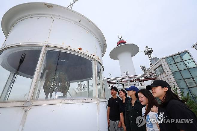 제7회 세계등대의 날을 기념해 16일 인천 중구 팔미도등대에서 진행된 팔미도등대 청소년 체험교실에 참여한 학생들이 옛 등대의 등명기(전구에서 나오는 빛을 렌즈 또는 거울을 이용해 멀리까지 내보내는 조명기구)를 살펴보고 있다.