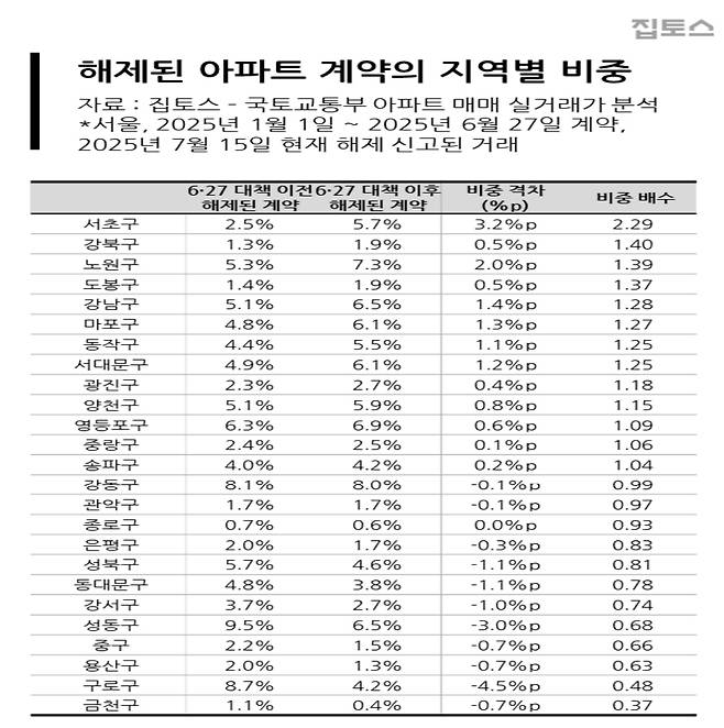 반면 집값 상승 폭이 크지 않았던 노원구(5.3%→7.3%)와 도봉구(1.4%→1.9%), 강북구(1.3%→1.9%)도 매매계약 해제 비중이 함께 상승했다. 이는 자기자본이 부족한 '영끌' 매수자들이 향후 집값 하락과 이자 부담을 우려해 서둘러 계약을 해제한 것으로 보인다고 집토스는 분석했다.