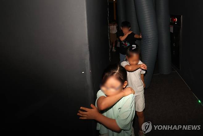 (부산=연합뉴스) 손형주 기자 = 16일 부산 동래구 온천동 부산119안전체험관에서 초등학교 1학년 학생들이 화재 발생시 좁은 복도를 탈출하는 교육을 받고 있다. 최근 부산에서 부모가 외출한 사이 발생한 아파트 화재로 자매가 잇따라 숨지는 일이 발생했다. 이 사건을 계기로 교육부와 교육청, 소방청 등 관계기관은 아동을 대상으로 화재 대응 및 안전 교육을 강화하겠다고 발표했다. 2025.7.16