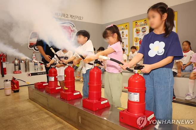 (부산=연합뉴스) 손형주 기자 = 16일 부산 동래구 온천동 부산119안전체험관에서 어린이들이 소화기 사용법을 교육받고 있다. 최근 부산에서 부모가 외출한 사이 발생한 아파트 화재로 자매가 잇따라 숨지는 일이 발생했다. 이 사건을 계기로 교육부와 교육청, 소방청 등 관계기관은 아동을 대상으로 화재 대응 및 안전 교육을 강화하겠다고 발표했다. 2025.7.16