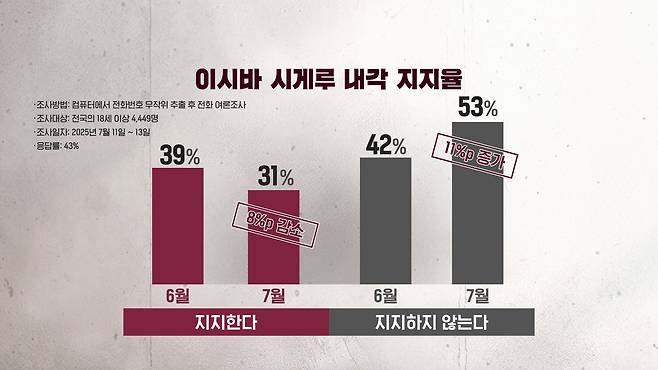 이시바 시게루 내각을 지지한다는 응답률도 31%로 약 한 달 전의 39%보다 크게 떨어졌습니다. 반대로 지지하지 않는다는 응답률은 같은 기간 42%에서 53%로 높아졌습니다. 왜 이런 결과가 나오는 걸까요?