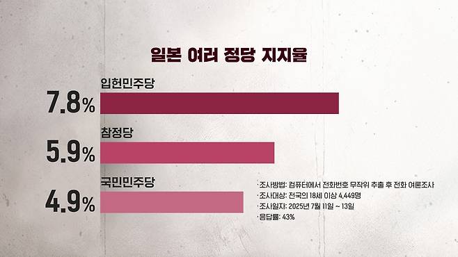 자민당 이외의 정당 지지율을 보면 입헌민주당이 7.8%, 참정당이 5.9%, 그리고 국민민주당이 4.9%입니다.
