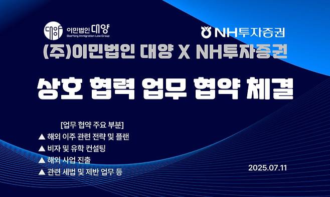 지난 11일 글로벌 비자·투자 전문 법률기업 ㈜이민법인 대양이 NH투자증권과 해외 이주 및 유학 컨설팅 분야에서 전략적 업무협약(MOU)을 체결했다고 밝혔다.