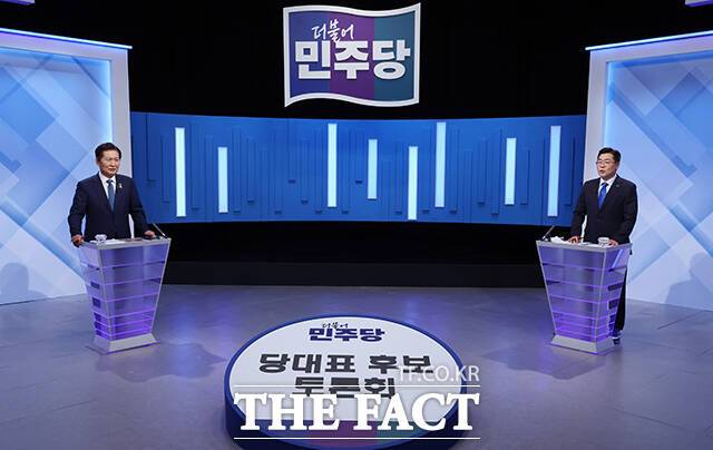 [더팩트ㅣ배정한 기자] 정청래(왼쪽)·박찬대 더불어민주당 당대표 후보가 16일 오후 서울 양천구 목동 SBS에서 열린 TV토론회에 앞서 기념촬영을 하고 있다.