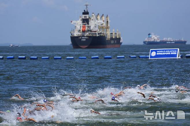 [싱가포르=AP/뉴시스] 16일(현지 시간) 싱가포르 센토사섬에서 열린 2025 싱가포르 세계수영선수권대회 오픈워터 남자 10㎞ 경기에 참여한 선수들이 힘차게 물을 가르고 있다. 강, 호수, 바다 등에서 펼치는 오픈워터 수영은 마라톤 수영이라고도 한다. 2025.07.16.