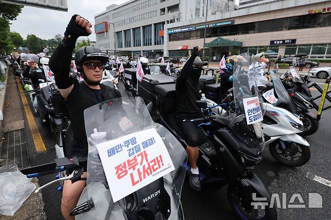 [서울=뉴시스] 권창회 기자 = 배달플랫폼노조 조합원과 배달라이더들이 16일서울 용산구 대통령실 인근에서 열린 갑질투성이 배민 쿠팡 규탄! 7.16 라이더 대행진 집회에서 구호를 외치고 있다. 2025.07.16. kch0523@newsis.com