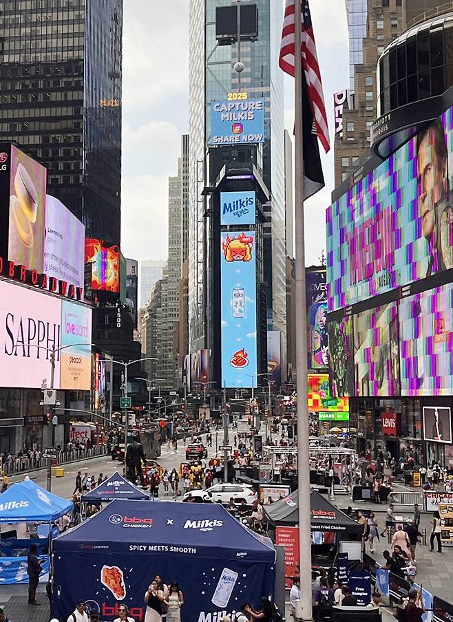 17일 롯데칠성음료에 따르면 지난 14일(현지시간) 미국 뉴욕 타임스퀘어에서 '밀키스' 옥외광고를 포함해 'Spicy Meets Smooth' 마케팅 캠페인을 펼쳤다. 뉴욕 타임스퀘어는 '세계의 교차로'로 불리는 세계적인 광고 명소이자 관광지 중 한 곳이다.