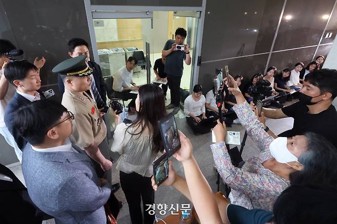 박 대령은 이날 오후 1시쯤 김규현· 하주희 변호사 등 변호인단 및 해병대 예비역과 함께 모습을 드러냈다. 현장에 모인 해병대예비역연대 회원들과 시민들은 박수와 응원으로 그를 맞았다. 박 대령은 환한 표정으로 시민들과 악수하고 포옹했다.