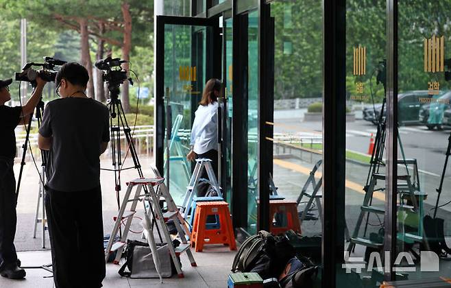 [서울=뉴시스] 조성우 기자 = 재구속 이후 내란 특검 소환 조사에 불응하고 있는 윤석열 전 대통령 측이 법원에 구속적부심사를 청구한 16일 내란 특검 사무실이 마련된 서울 서초구 서울고등검찰청 앞에 취재진 장비가 놓여 있다. 2025.07.16. xconfind@newsis.com