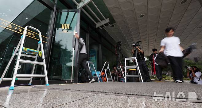 [서울=뉴시스] 조성우 기자 = 재구속 이후 내란 특검 소환 조사에 불응하고 있는 윤석열 전 대통령 측이 법원에 구속적부심사를 청구한 16일 내란 특검 사무실이 마련된 서울 서초구 서울고등검찰청 앞에 취재진 장비가 놓여 있다. 2025.07.16. xconfind@newsis.com