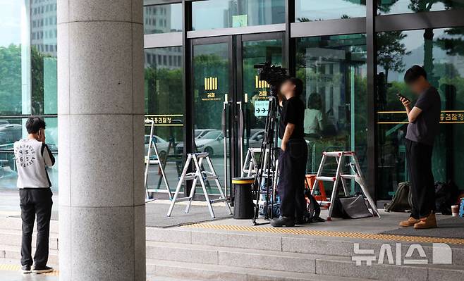 [서울=뉴시스] 조성우 기자 = 재구속 이후 내란 특검 소환 조사에 불응하고 있는 윤석열 전 대통령 측이 법원에 구속적부심사를 청구한 16일 내란 특검 사무실이 마련된 서울 서초구 서울고등검찰청 앞에 취재진 장비가 놓여 있다. 2025.07.16. xconfind@newsis.com