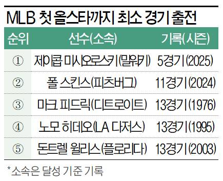 미시오로스키는 이날 미국 조지아주 트루이스트 파크에서 열린 MLB 올스타전에 내셔널리그(NL) 11번째 투수로 마운드를 밟아 1이닝 1피안타 무실점을 기록했다. 올 시즌 빅리그에 데뷔한 미시오로스키는 통산 5경기를 소화한 뒤 '별들의 무대'에 초대돼 부문 역대 최소 경기 기록(종전 2024년 폴 스킨스·11경기)을 경신했다. 성적(4승 1패 평균자책점 2.81)이 뛰어나고 최고 103마일(165.8㎞/h)에 이르는 대포알 강속구를 던질 만큼 잠재력도 풍부하지만 비판 여론도 만만치 않았다. 크리스토퍼 산체스(필라델피아 필리스)를 비롯해 그보다 더 많은 이닝을 소화하면서 더 좋은 기록을 낸 선수가 적지 않다는 것도 논란을 가속한 요인이었다.