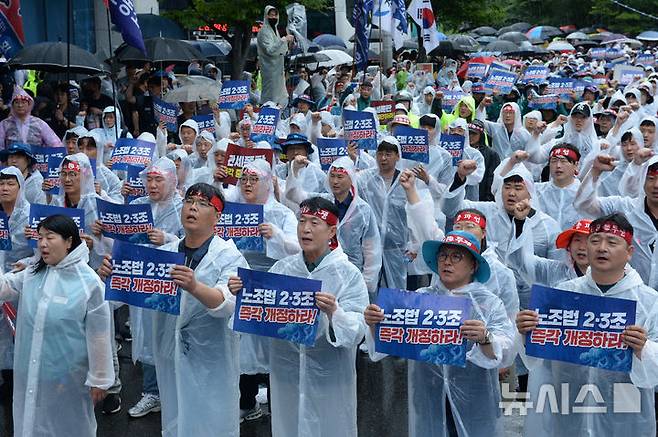[울산=뉴시스] 배병수 기자 = 민주노총 울산지역본부는 16일 오후 울산시청 남문앞에서 열린 2025년 민주노총 총파업 총력투쟁 울산대회에서 조합원들이 구호를 외치고 있다. 2025.07.16.bbs@newsis.com.