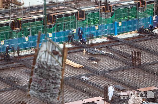 [서울=뉴시스] 황준선 기자 = 16일 서울 시내 한 공사현장에서 근로자들이 업무를 하고 있다.