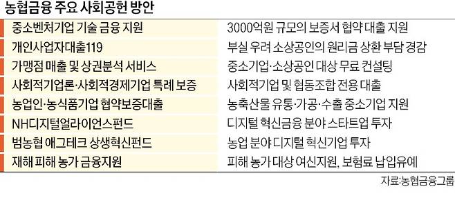 농협금융지주는 농협 정체성 및 금융업 특성을 살린 다양한 상생금융 활동에 참여하고 있다. 서민과 중소기업 전용 금융상품 판매를 통해 금융소외계층의 편익 증진에 앞장서는 중이다.