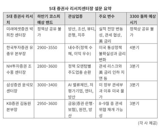 [파이낸셜뉴스] 국내 5대 증권사는 올해 3·4분기에 코스피지수가 3300을 돌파한 후 상승 동력을 이어갈 것이란 전망을 내놨다. 올 하반기 코스피 예상 상단 밴드는 3600선이다. 다만 미중 간 관세 협상과 미국 연방준비제도(Fed·연준)의 금리 정책 등이 주요 변수로 꼽혔다.