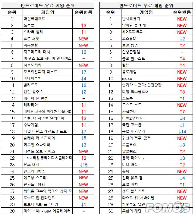 안드로이드 무료 게임 순위에서는 위메이드맥스의 신작 '악마단 돌겨억!'이 2위를 기록했다.