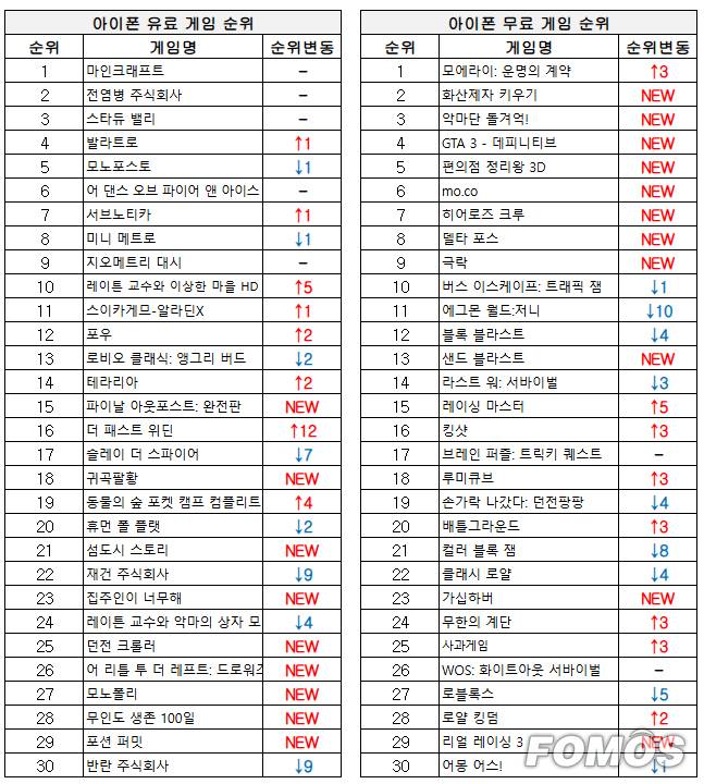 유료 게임 순위에서는 낮에는 왕국을 건설하고 밤에는 전투를 펼치며 왕국을 지키는 전략 게임 '쓰론폴' 3계단 상승하며 2위에 올랐다.