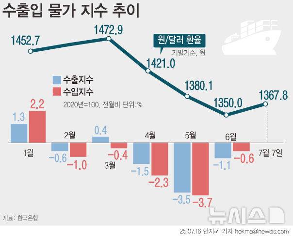 [서울=뉴시스] 환율 하락 영향으로 지난달 수입물가가 5개월 연속 내림세를 기록했다. 중동 긴장에 따른 국제유가 상승에도 원화 강세가 가격 하락을 견인한 것으로 분석된다. 16일 한국은행에 따르면 지난달 수입물가는 133.86(2020=100)으로 전월(134.61) 대비 0.6% 떨어졌다. 5개월 연속 하락이다. 전년 동기 대비로는 6.2% 떨어져 3개월째 하락했다. 한국은행은 7월에도 환율과 유가 변수에 전망 불확실성이 높다고 진단했다. (그래픽=안지혜 기자)