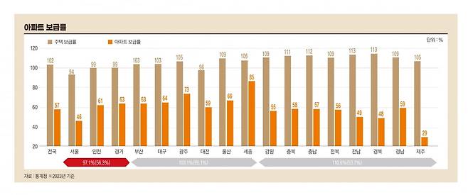 앞 페이지 표에서 흐린 색 그래프는 아파트 보급률이다. 우리나라 가구 중 57%가 아파트에 거주한다는 뜻이다. 그런데 서울의 경우는 46%에 불과하다. 85%나 되는 세종시와 극단적인 대비를 보이고 있다. 아파트와 생활 패턴이 잘 맞지 않는 농어촌 지역도 아닌 서울에서 아파트에 거주하는 가구가 46%에 불과하다는 것은 서울의 아파트 수요가 적기 때문이 아니라 아파트 공급이 턱없이 적었기 때문이다.