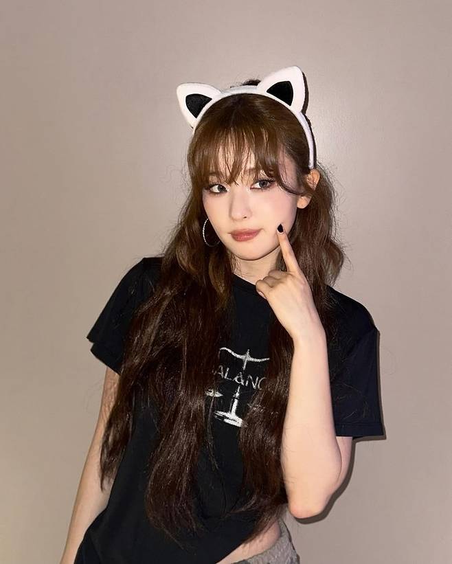 손가락으로 볼을 콕 찌르는 슬기의 포즈는 고양이 귀 헤어밴드와 조화를 이루며 생동감 넘치는 에너지를 전달한다.