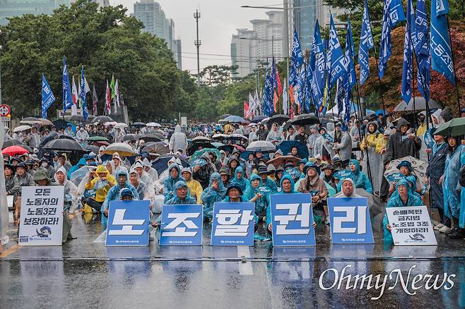 민주노총이 16일 오후 서울 여의도 국회 앞에서 전국 동시 총파업 대회를 열고 윤석열 정부의 반노동 정책폐기, 노조법 2·3조 개정과 노정 교섭 수용을 촉구하고 있다.