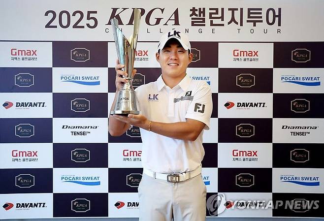 (서울=연합뉴스) 김상현이 16일 충남 태안 솔라고 컨트리클럽에서 열린 2025 KPGA 챌린지투어 11회 대회에서 우승해 우승컵을 들고 기념 촬영하고 있다. 2025.7.16 [KPGA 제공. 재판매 및 DB 금지]