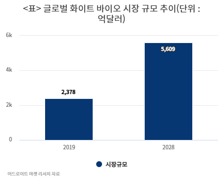 정유 사업과 달리 화이트 바이오 사업은 대외 변수에 상대적으로 덜 민감하게 반응한다. 사업이 정상 궤도에 오를 시 일정 수준 이상의 매출을 꾸준히 달성할 것으로 예상된다. 성장 가능성도 크다. 시장조사기관 어드로이트 마켓 리서치는 글로벌 화이트 바이오 시장 규모가 2019년 2378억달러(330조원)에서 연평균 10.1% 성장, 2028년 5609억달러(778조원)에 이를 것으로 분석했다.