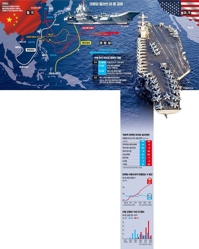 중국의 급속한 해군력 증강으로 그동안 태평양 제해권을 쥐고 있던 미국은 비상이 걸린 상태다. 미 의회조사국(CRS) 보고서에 따르면 중국은 지난해 기준 234척의 군함(보조·지원함 제외)을 보유해 군함 수 기준으로 이미 세계 최대 규모의 해군력을 보유하고 있다. 반면 미국 해군 함정은 219척에 불과하다.