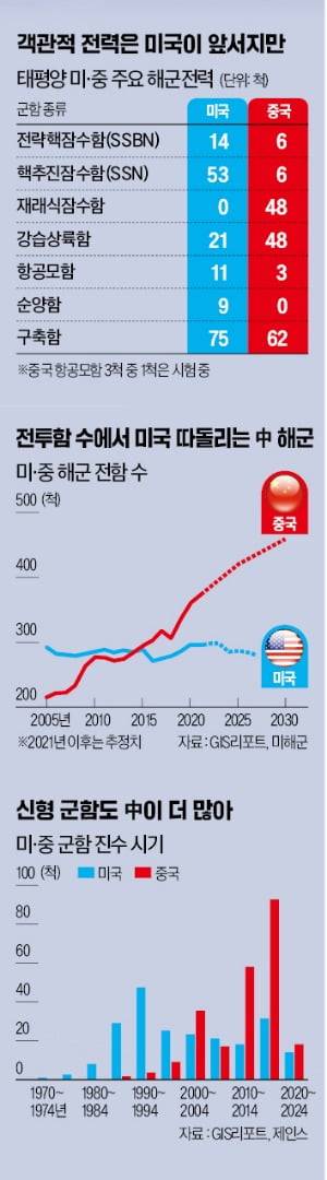 질적인 측면서도 빠르게 따라오고 있다. 미 전략국제문제연구소(CSIS)는 중국 군함의 약 70%가 2010년 이후 진수된 데 비해 미 해군 군함은 25% 정도만 그렇다고 분석했다. 그만큼 중국 군함이 신형이란 얘기다. 중국의 최신예 구축함인 렌하이급(타입055)은 112개의 수직발사체계(VLS)를 갖췄고, 사거리 300㎞의 초음속 대함 순항미사일(YJ-18)을 발사할 수 있다. GIS리포트는 “크기와 속도, 위상배열레이더 등 성능을 고려할 때 055형은 지구상 가장 강력한 전투함”이라고 평가했다.