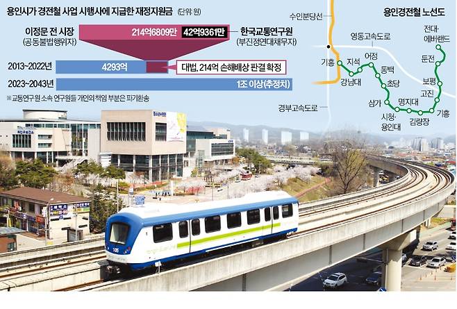 파기환송심 재판부는 지난해 4월 이 전 시장과 한국교통연구원 등이 용인시에 214억6000여만원을 지급해야 한다는 취지로 판결했다. 지방자치법에 따르면 손해배상을 청구한 주민소송에서 원고 측 승소 판결이 확정되면 해당 지자체장은 이로부터 60일 이내에 피고 측에 배상금 지급을 청구해야 한다. 기한 내 지급되지 않으면 반환 청구 소송을 재차 낼 수 있다. 용인시는 “법원의 판결을 존중한다”며 “법이 정한 절차를 차질 없이 성실히 진행할 방침”이라고 밝혔다.